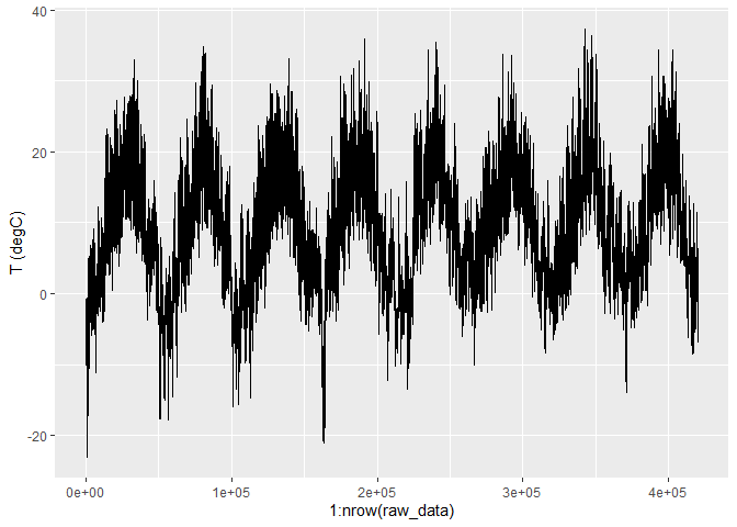 ggplot(raw_data, aes(x = 1:nrow(raw_data), y = `T (degC)`)) + geom_line()