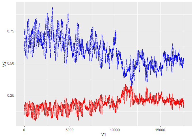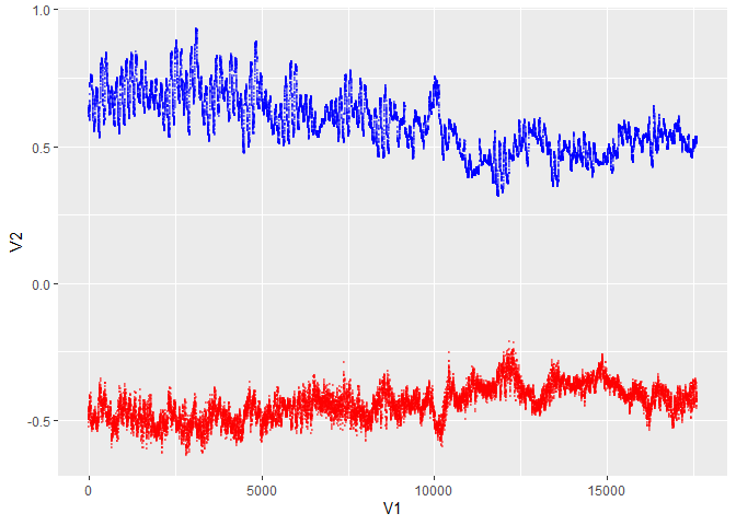ggplot(plot_data, aes(x = V1, y = V2)) + geom_point(colour = "blue",